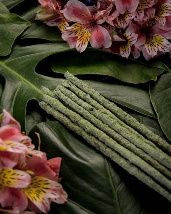 Deze wierook bestaat verder uit houtskool en biomassa van fruit. Er zitten 6 extra stevige stokken in het fleurige doosje die elk zo'n 60 minuten branden.