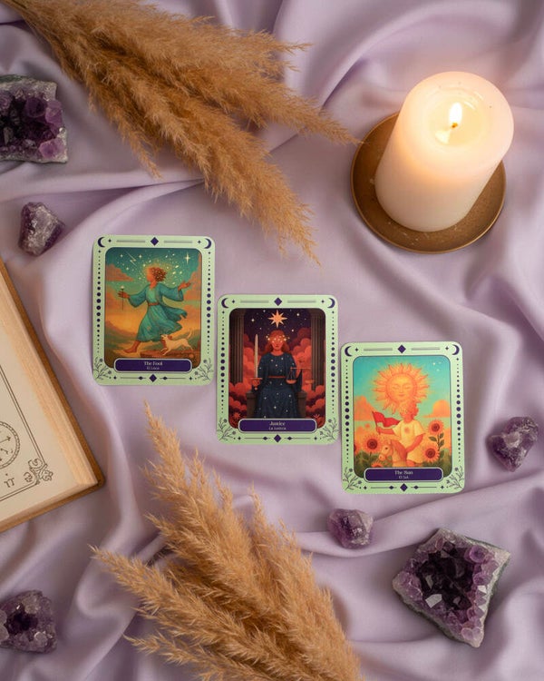 Elke doos bevat één kaart geïnspireerd op de grote arcana. Geen keuze, maar een ontmoeting. De kaart die je ontvangt draagt een unieke boodschap, intuïtief en daardoor afgestemd op het moment waarop jij je doosje ontvangt en opent.