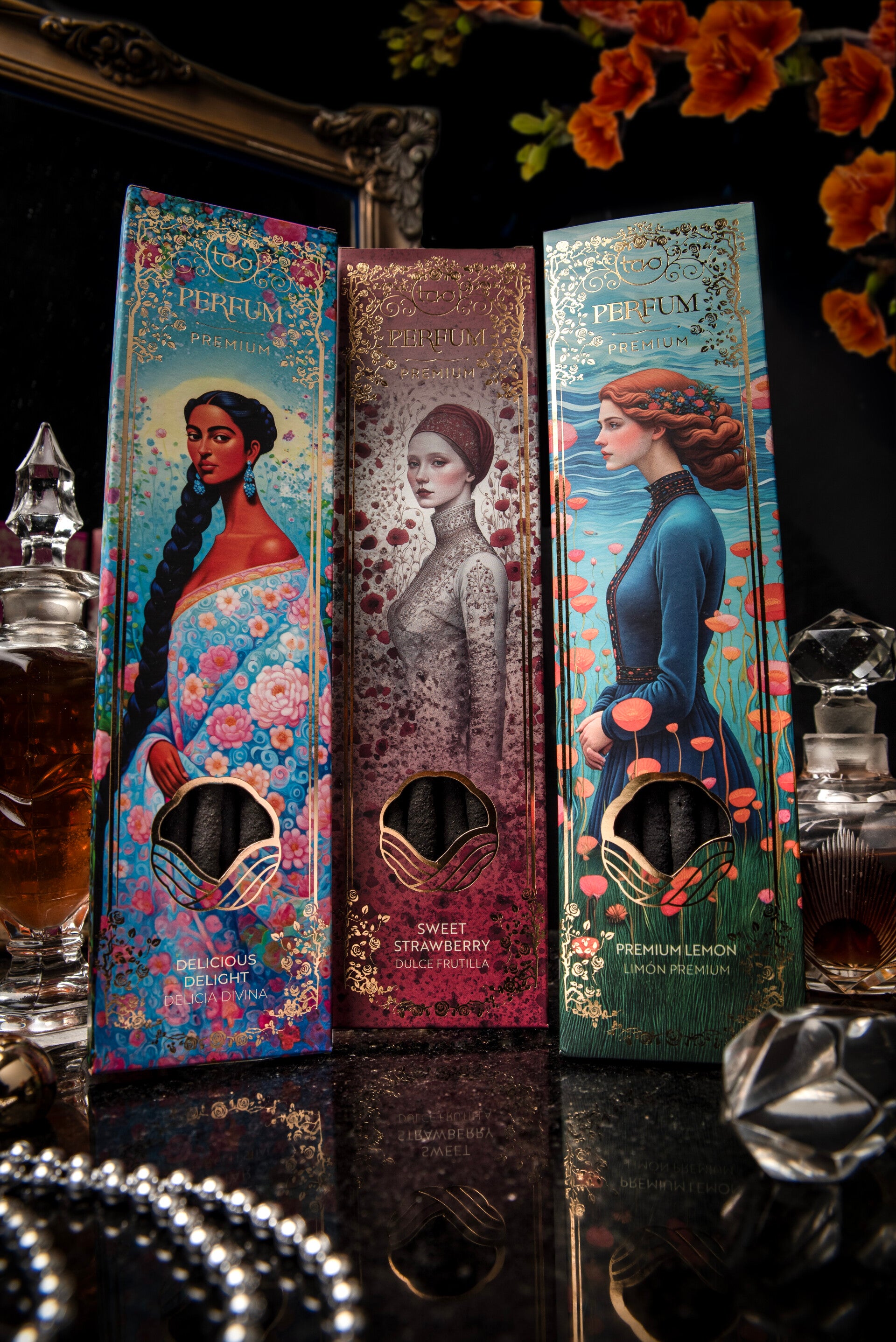 De verpakking spreekt al meteen tot de verbeelding. Ze ademen de sfeer van vrouwelijke kracht zoals we deze ook wel kennen van kunstenaars (v/m) uit het 'Fin de Siècle' en de vroege Jugendstil of Art Deco. Een tikje exotisch, mystiek en gevoel voor natuurlijke vormen en decoraties geïnspireerd op de natuurlijke vormen. Een hint van romantiek, poederachtige kleuren, en bloemmotieven sieren en accentueren de vrouwelijke vormen.